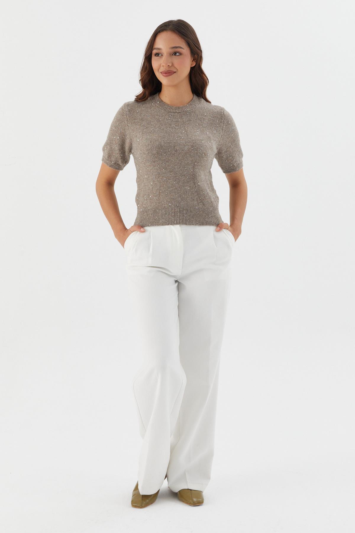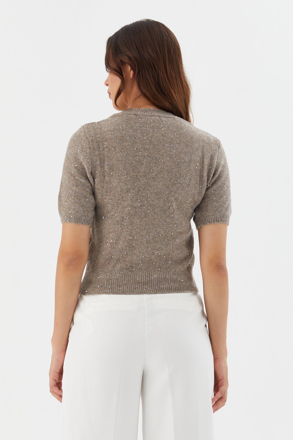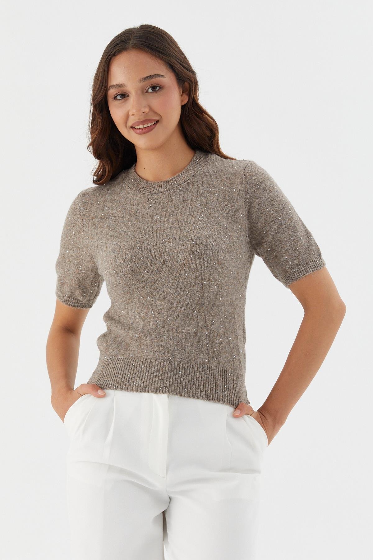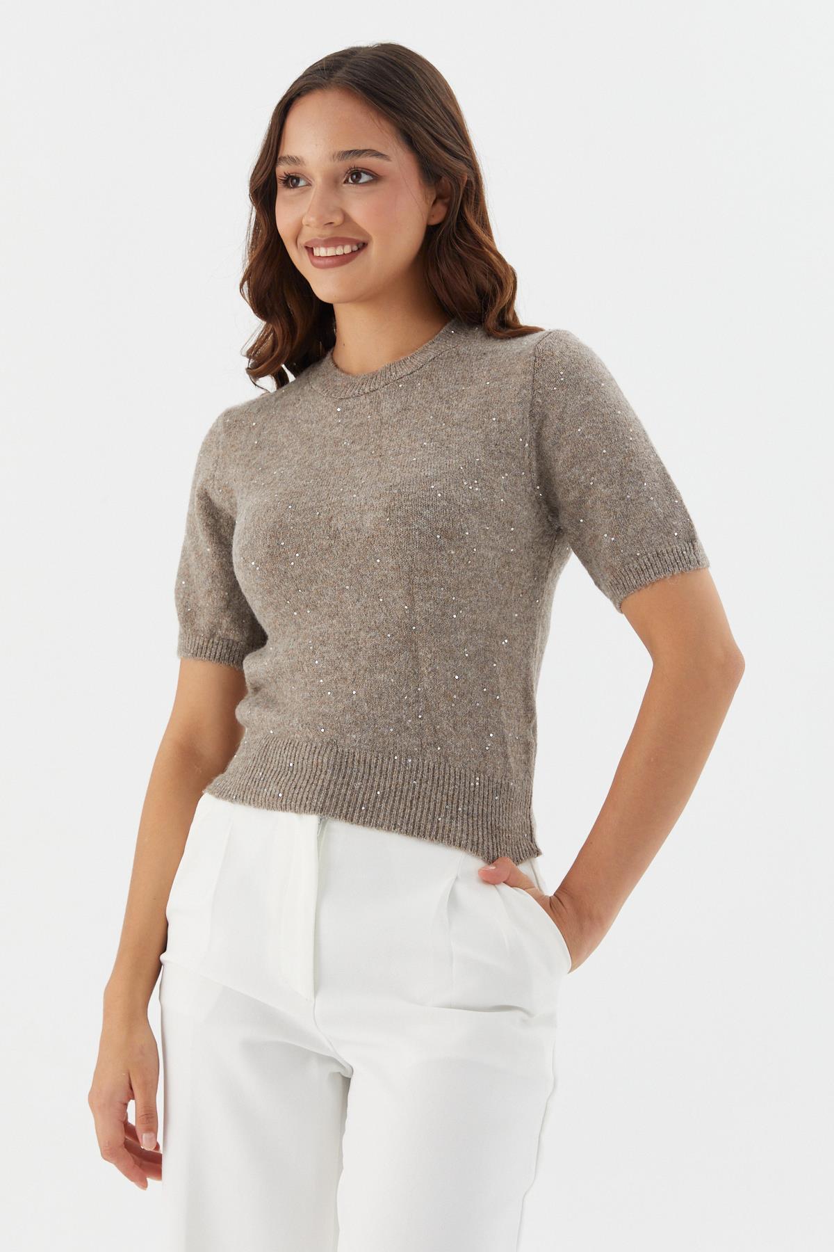 Simli Kısa Kol Triko Bluz VIZON (WTRI012P0073_966)